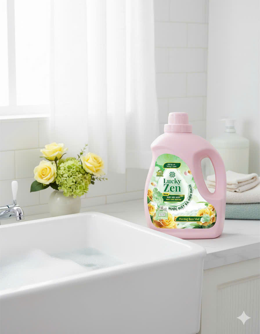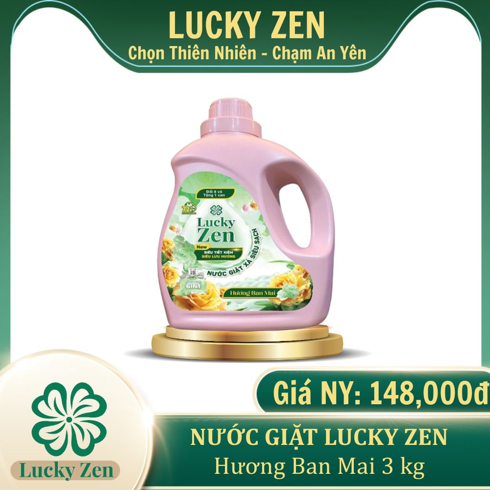 " Thương hiệu Lucky Zen từ lâu đã quá quen thuộc với các chị em nội trợ. Nước giặt tinh dầu thơm thế hệ mới có thể đánh bay những vết bẩn cứng đầu nhất như dầu nhớt một cách nhanh chóng và hiệu quả. Đồng thời, còn xả sạch bọt xà phòng nhanh chóng, mang lại hương thơm bền lâu trên áo quần.! "